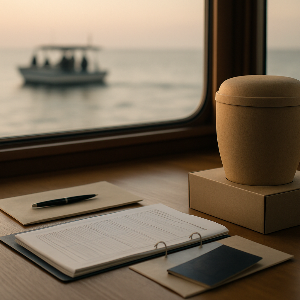 • Übernahme der Formalitäten: Meldung beim Standesamt, Koordination mit Krematorium und Reederei, Einholung aller nötigen Genehmigungen.